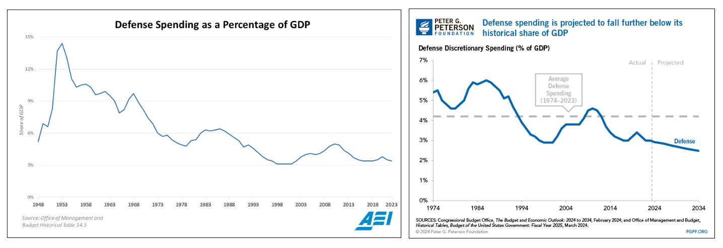 Most analysts expect future defense spending to drop as a percentage of GDP to 2.5% by 2034.