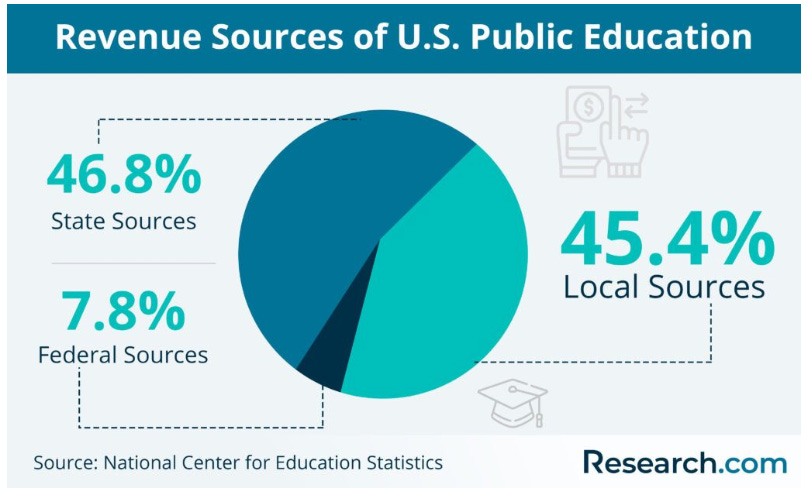A more accurate understanding of U.S. Education spending doesn’t start with the Education Department’s Budget or the grants they control, but on the combination of Local, State, and Federal funding. When you sum all that up (12,546 school districts, 571 county-dependent school systems, 227 municipal systems, 50 U.S. states, and 3,982 degree granting postsecondary institutions), you get total public spending on education at about double defense spending.