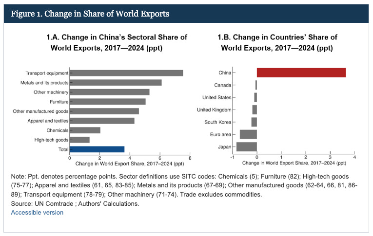 This note contributes to that discussion in two important ways. First, we document how China achieved this unprecedented trade surplus by establishing three salient aspects of China’s trade dominance: the breadth of its export expansion across sectors, the corresponding loss of export market share by advanced economies, and the limited growth of China’s imports outside of commodities. Second, we examine the relationship between China’s industrial policies and sectoral trade outcomes, highlighting systematic links between policy interventions, export growth, and trade balance dynamics. Taken together, the evidence suggests that industrial policy is a contributing factor to China’s trade surplus and should be considered alongside more traditional macroeconomic drivers.