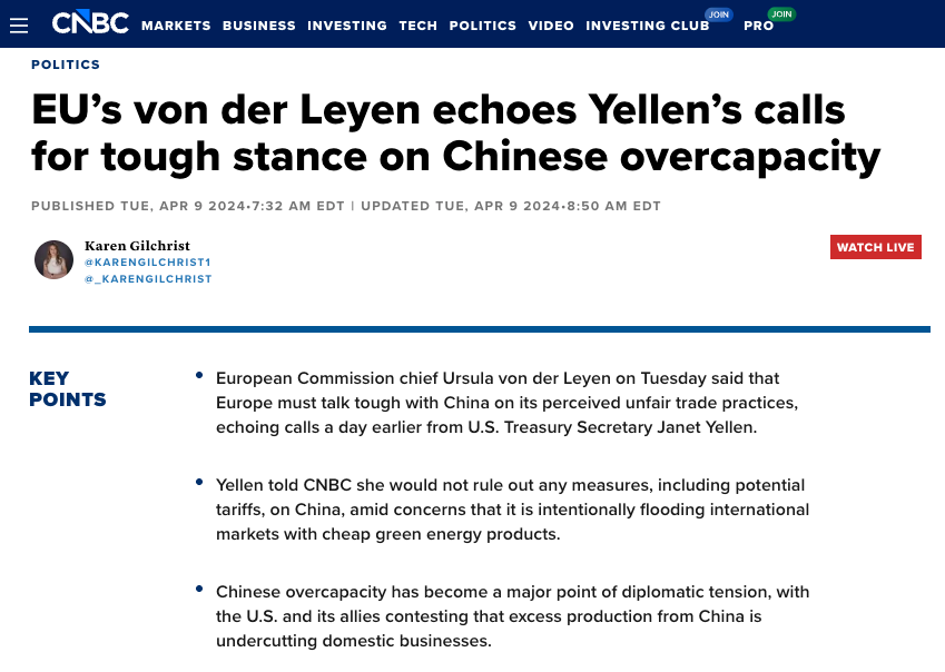 Now the PRC is dumping even more on Europe, which is undermining European firms in their home markets and leading to its own “China Shock.” That will have political and policy ramifications, just as it did in the United States, and will eventually convince European politicians to abandon their orthodox commitment to free trade… or it will lead to a political rupture that creates the same effect.