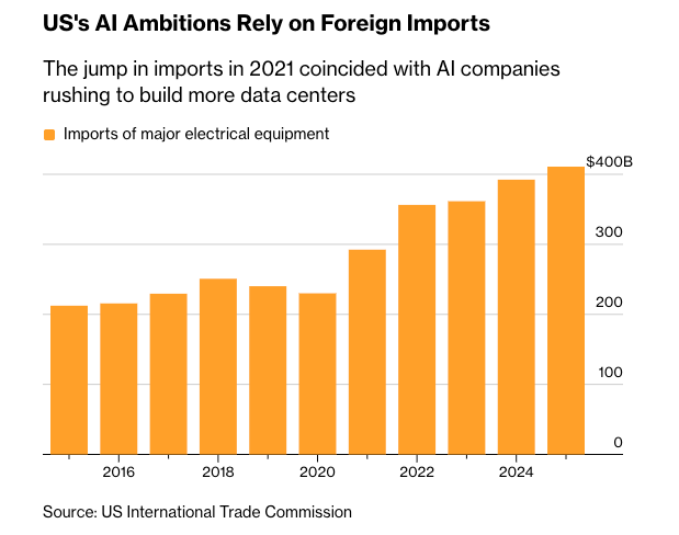 The struggle to manufacture transformers, switchgear and batteries domestically has forced the US to rely on imports, delaying data center construction.