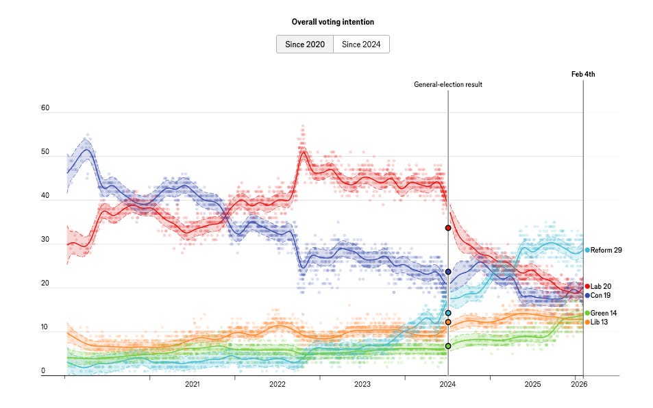 From the Economist, “How unpopular is Britain’s Labour government?,” February 6, 2026.