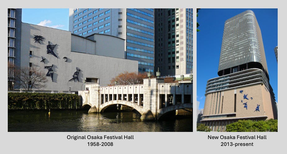 The old and new Festival Hall in Osaka, the building on the left is where Journey performed their first show of the Escape Tour on July 27, 1981.