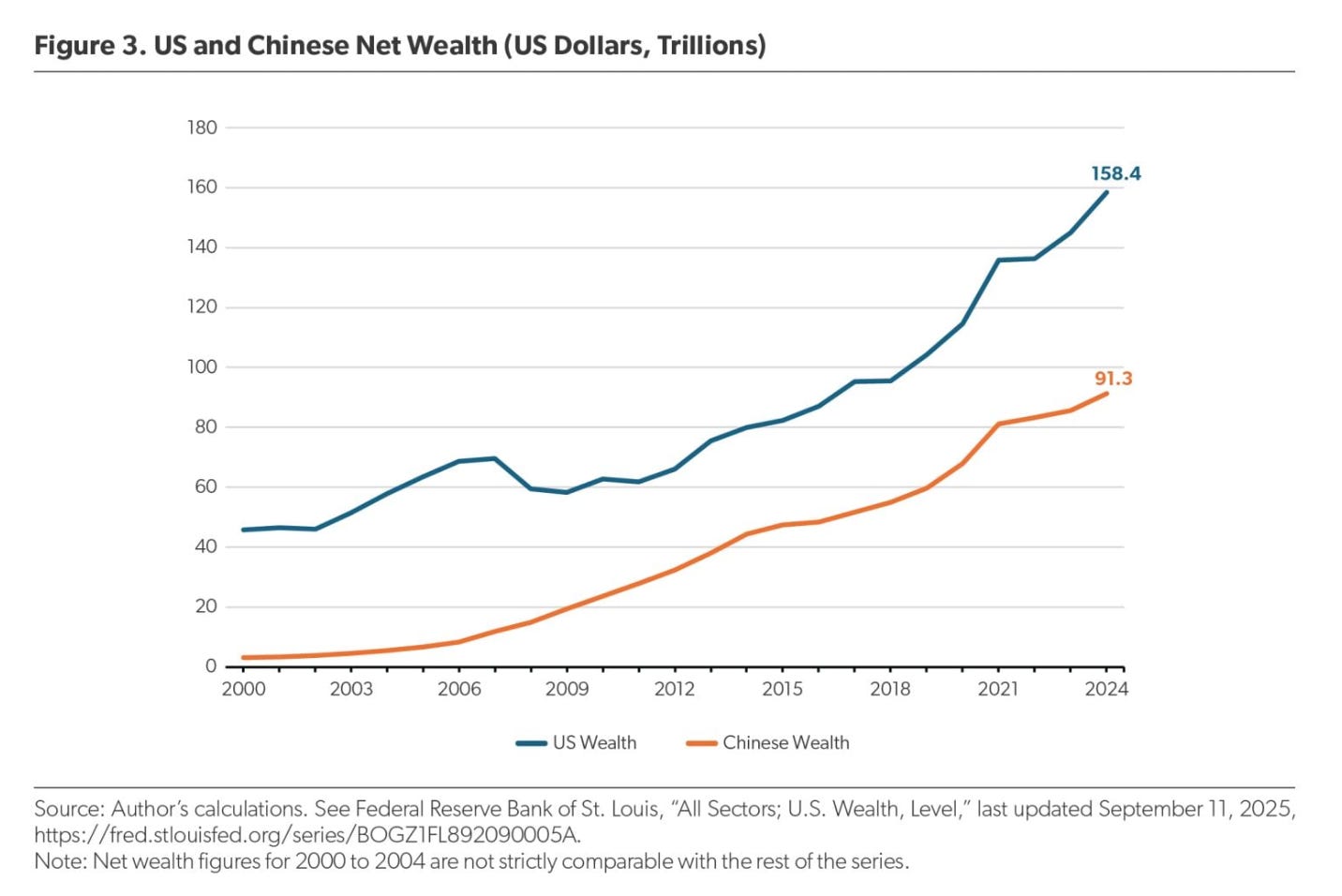 The wealth series shows a pivot in 2015. For at least a decade prior to that, Chinese wealth grew far more rapidly than official GDP and American wealth did. Since 2015, however, Chinese wealth gains have been uneven, and the American wealth lead has expanded.