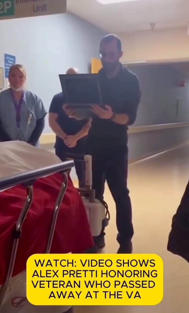 To give you a sense of who Alex Pretti was, here is a clip from 2024 of Pretti honoring a deceased veteran at the VA hospital where he worked. To its shame, the Veterans Administration has yet to officially recognize that Alex Pretti worked for them as a nurse.