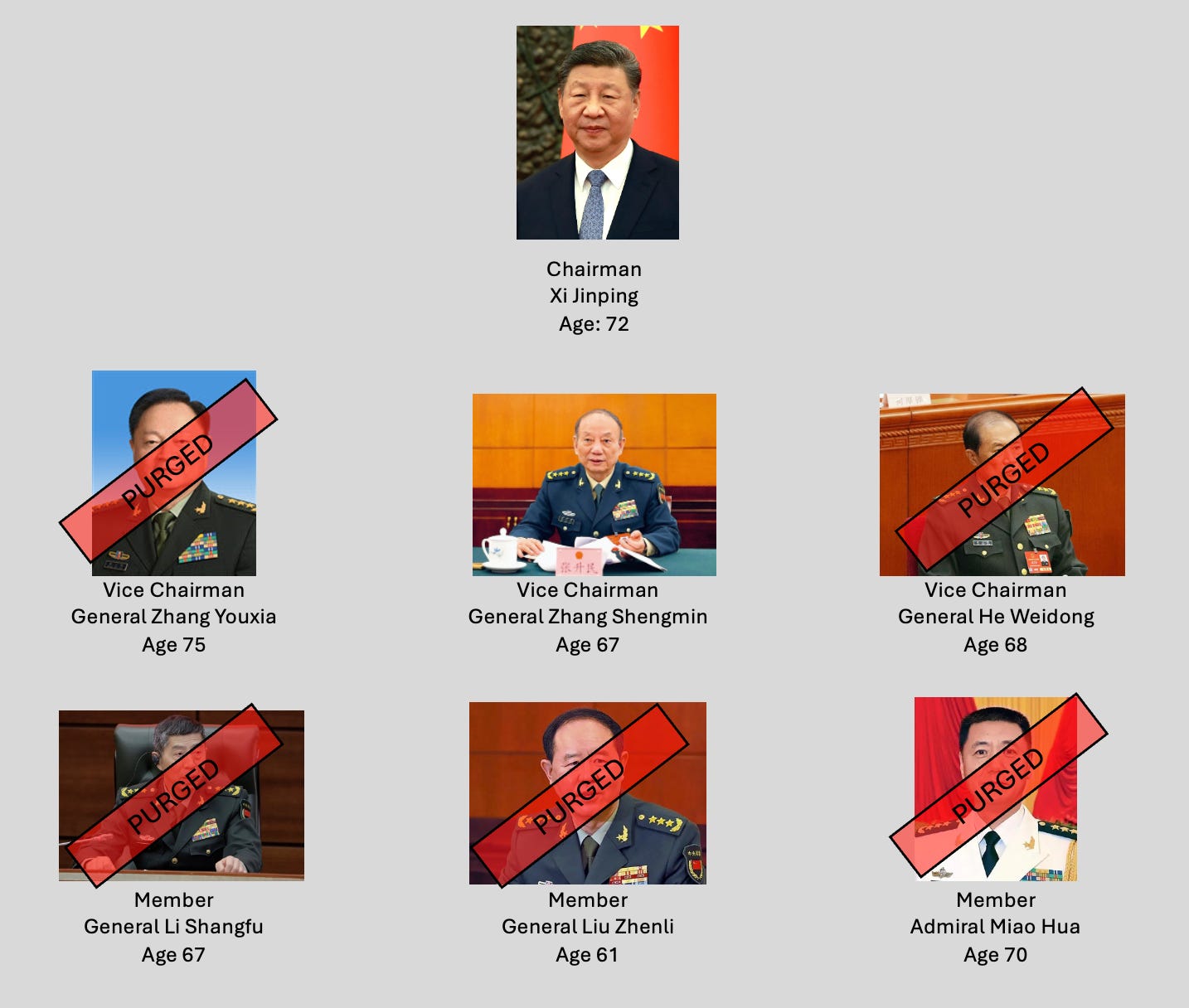 In “normal times” (and I deliberately put that in quotation marks because there has never really been a normal period in the bloodsport that is CCP domestic politics), the CMC has seven members including the Chairman, which is usually the General Secretary of the Chinese Communist Party. With these purges, there is only one member left aside from Xi Jinping.