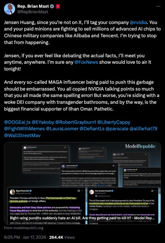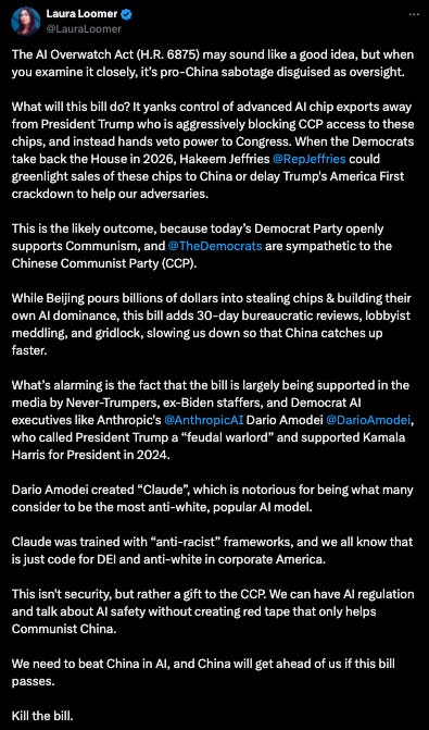 It began on Thursday, when popular conservatives including Laura Loomer, Brad Parscale, and Ryan Fournier suddenly began posting extremely similar criticisms of the AI OVERWATCH Act. The bill had received relatively little public attention since its introduction in December 2025.