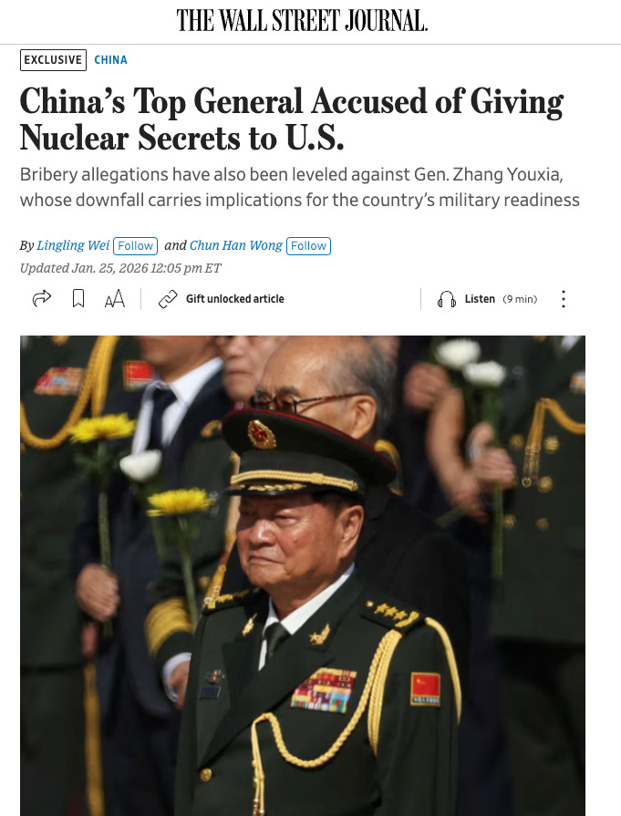 I would be very surprised if General Zhang actually leaked “core technical data on China’s nuclear weapons to the U.S.,” but that is an accusation that would undermine the credibility of anyone who tried to defend Zhang from Xi’s purge. I suspect the details will slowly emerge over months/years and will be filtered through the Party’s propaganda apparatus… meaning we won’t really know for sure.